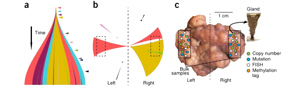 图1. 全基因组和外显子测序揭示了肿瘤演化的大爆炸模型